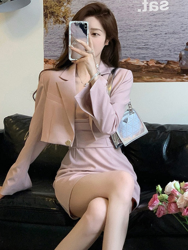 Autumn Pink Two Piece Dress Set Women Blazer Coat+Strap Dress Set Female Casual Korean Fashion Slim Elegant Dress Suit 2022 New