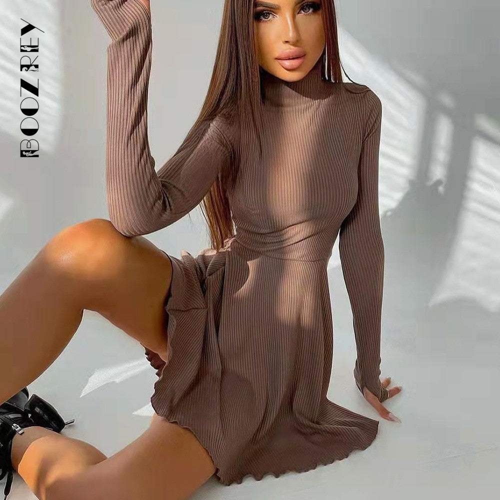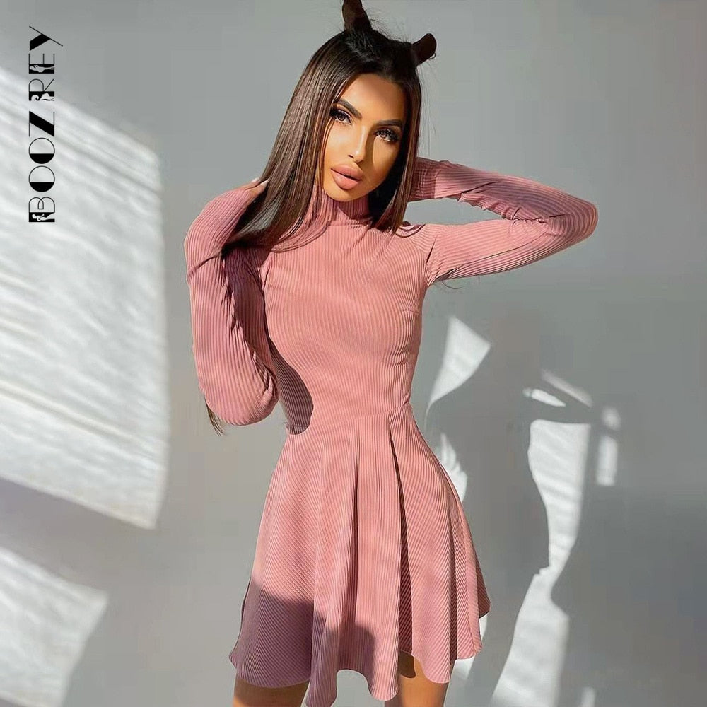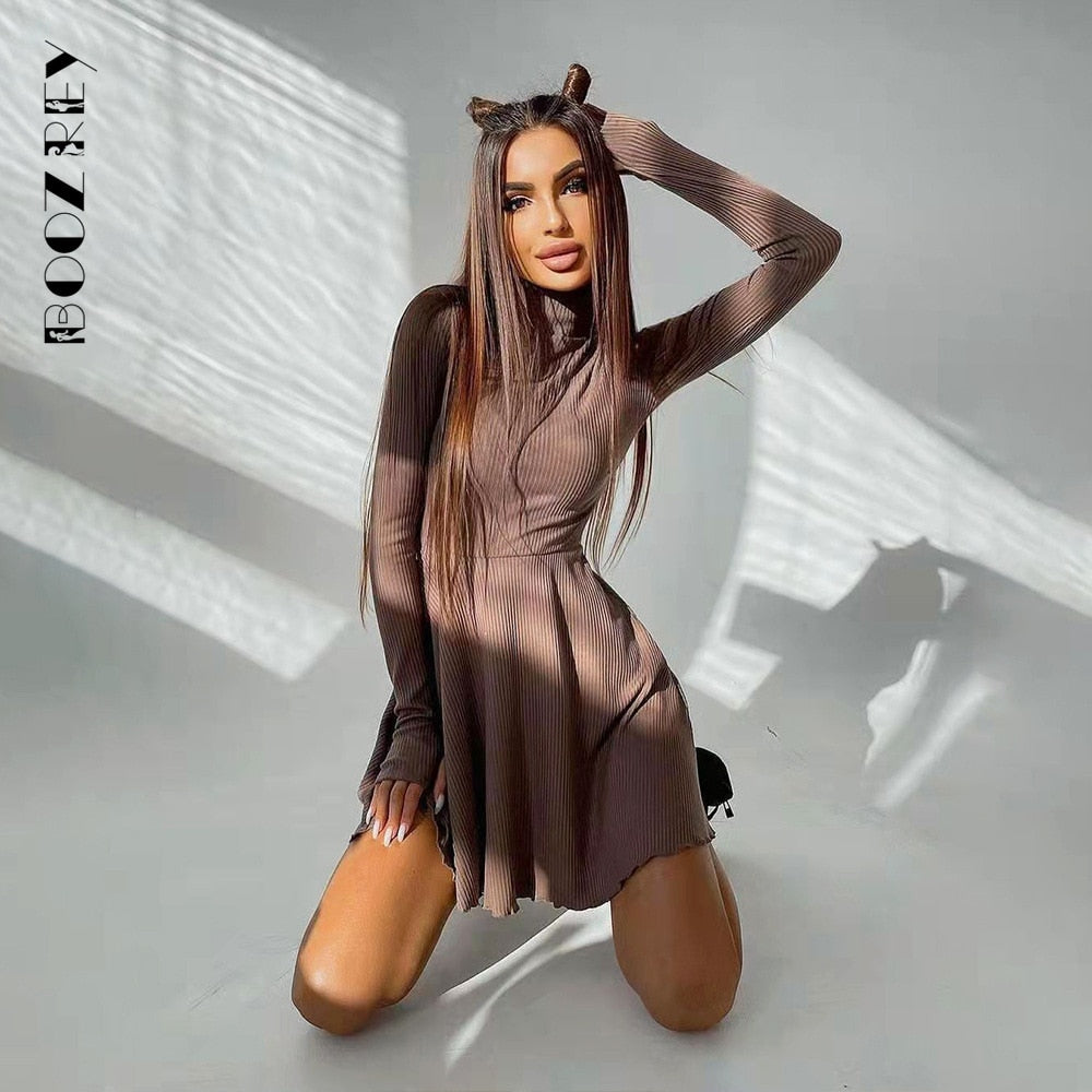 BoozRey Elegant Solid Dress for Women Long Sleeve Knitted Bottoming A-line Pleated Skirt Casual Streetwear Turtleneck Dress Girl