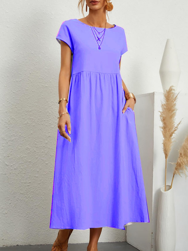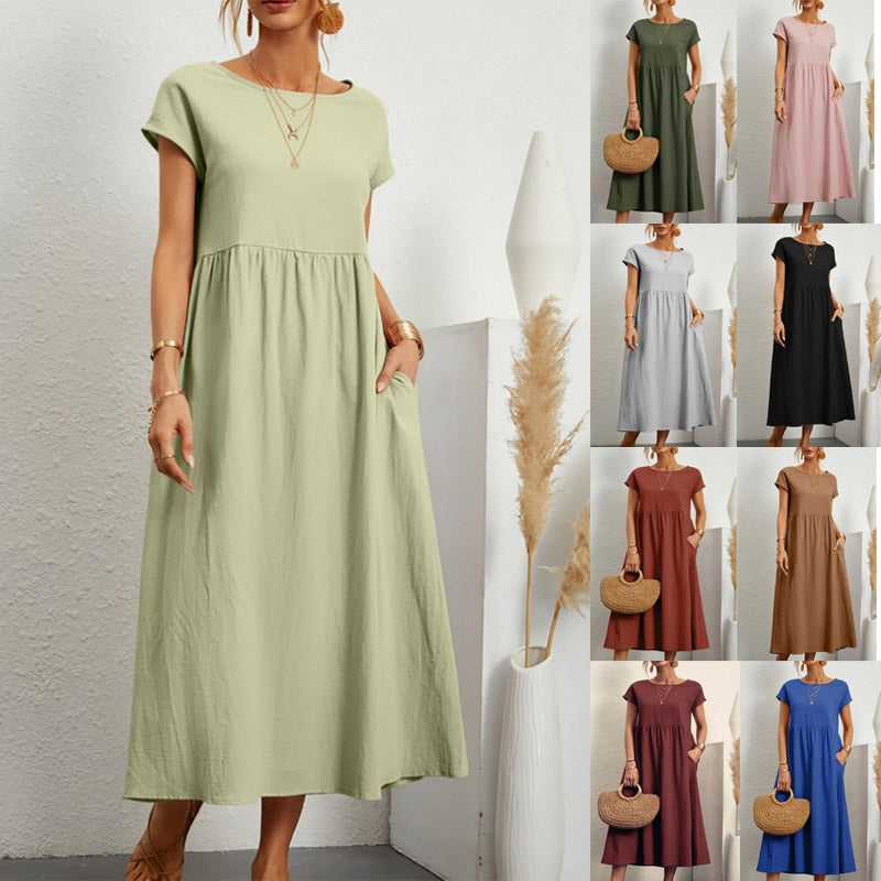 Harajuku Solid Long Dress Women Summer Casual Short Sleeve O Neck Loose Sundress 2023 Y2K Cotton and Linen Robe Dresses Clothes