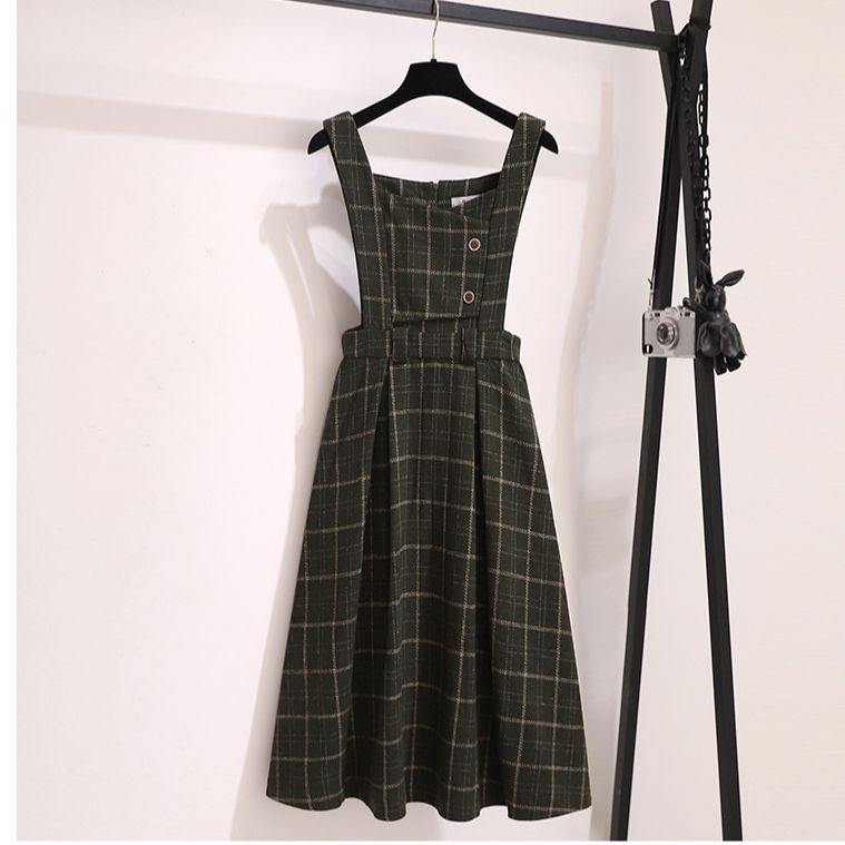 High Quality Fall Winter Women Sweater Overalls Dress Sets Casual Knitted Tops +Plaid Woolen Dress 2 Piece Sets Outfits Female