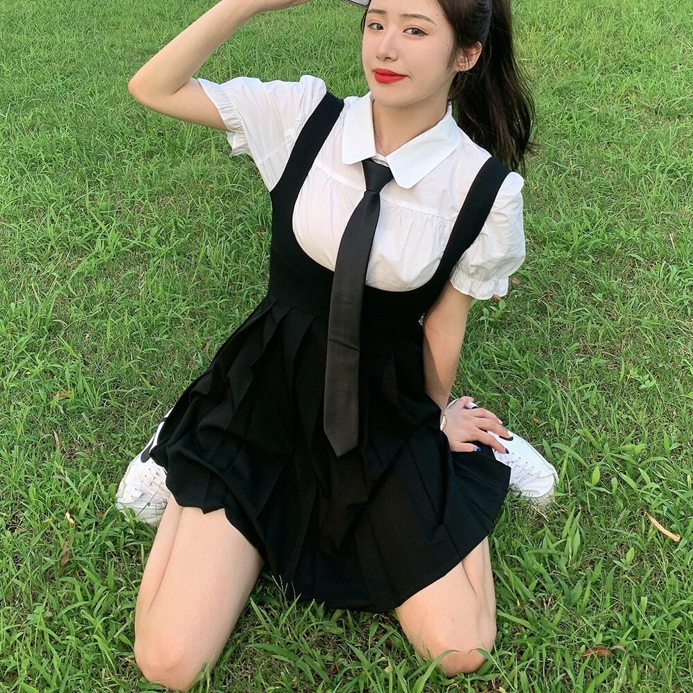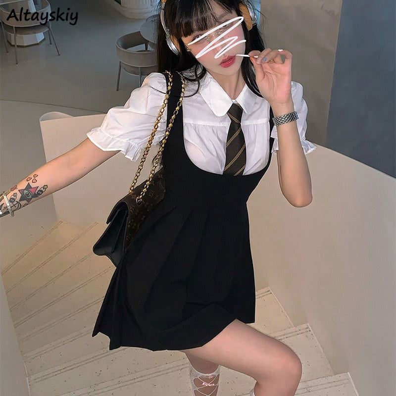 Women Dress Sets Preppy Style Slim High Street Girl Sweet Ins Puff Sleeve Shirts Pleated Dresses Student Harajuku Ulzzang JK Hot